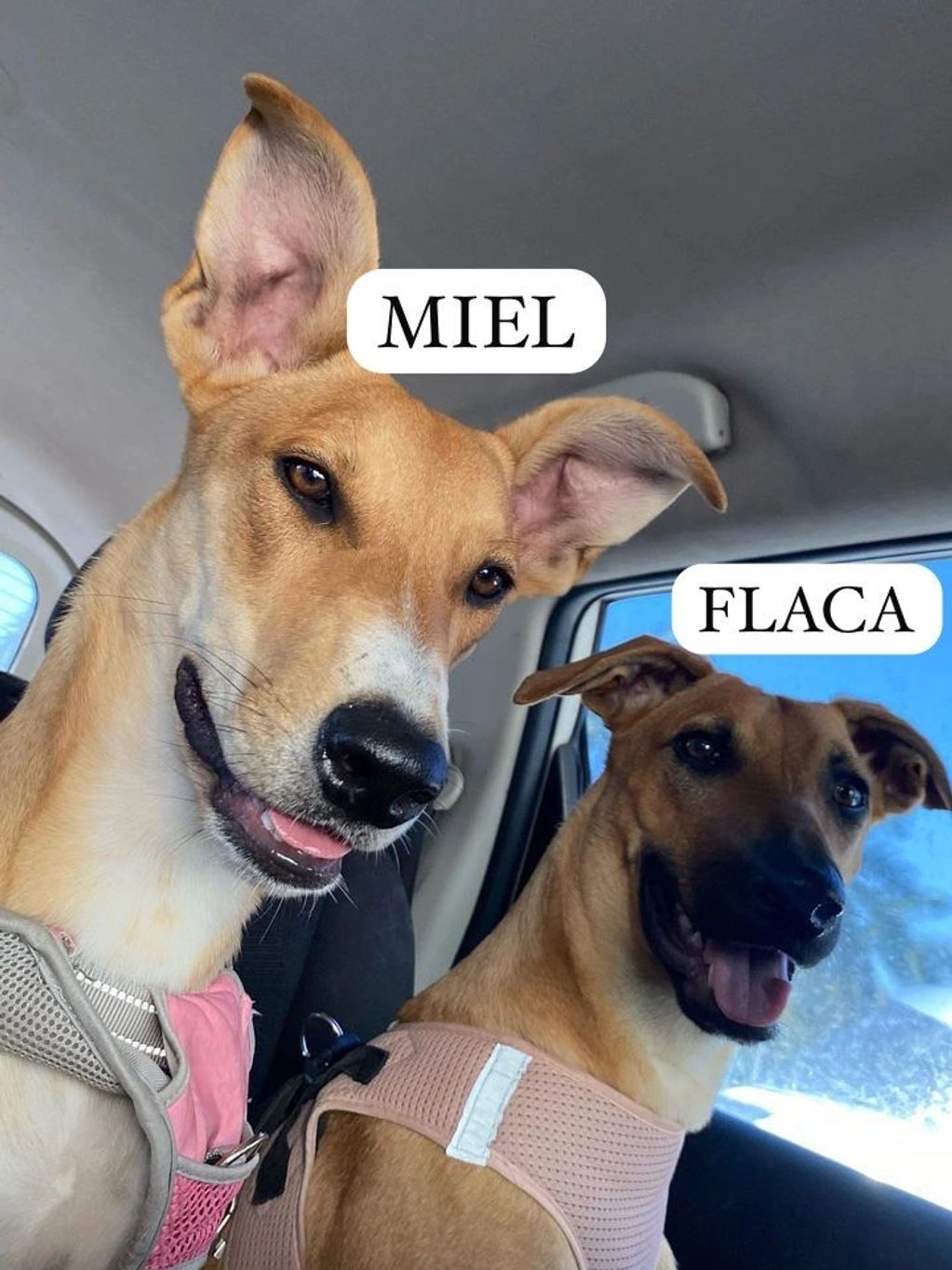 Miel and Flaca were found inside a plastic bag on the banks of a river. Thankfully they were rescued in time to be taken to the emergency room. Both female dogs are 1.5 years old, Labrador mix, weigh 14 kilos, medium/large size. Both are very sociable with people, children and dogs. They are very playful and their favorite pastime is hiking and swimming.